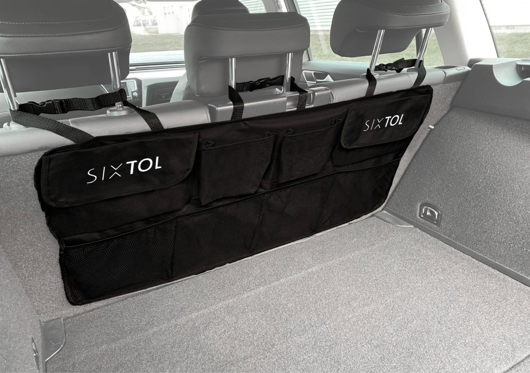 Full descriptionPractical hanging car organizer SIXTOL CAR POCKETS for the rear seats with eight pockets.