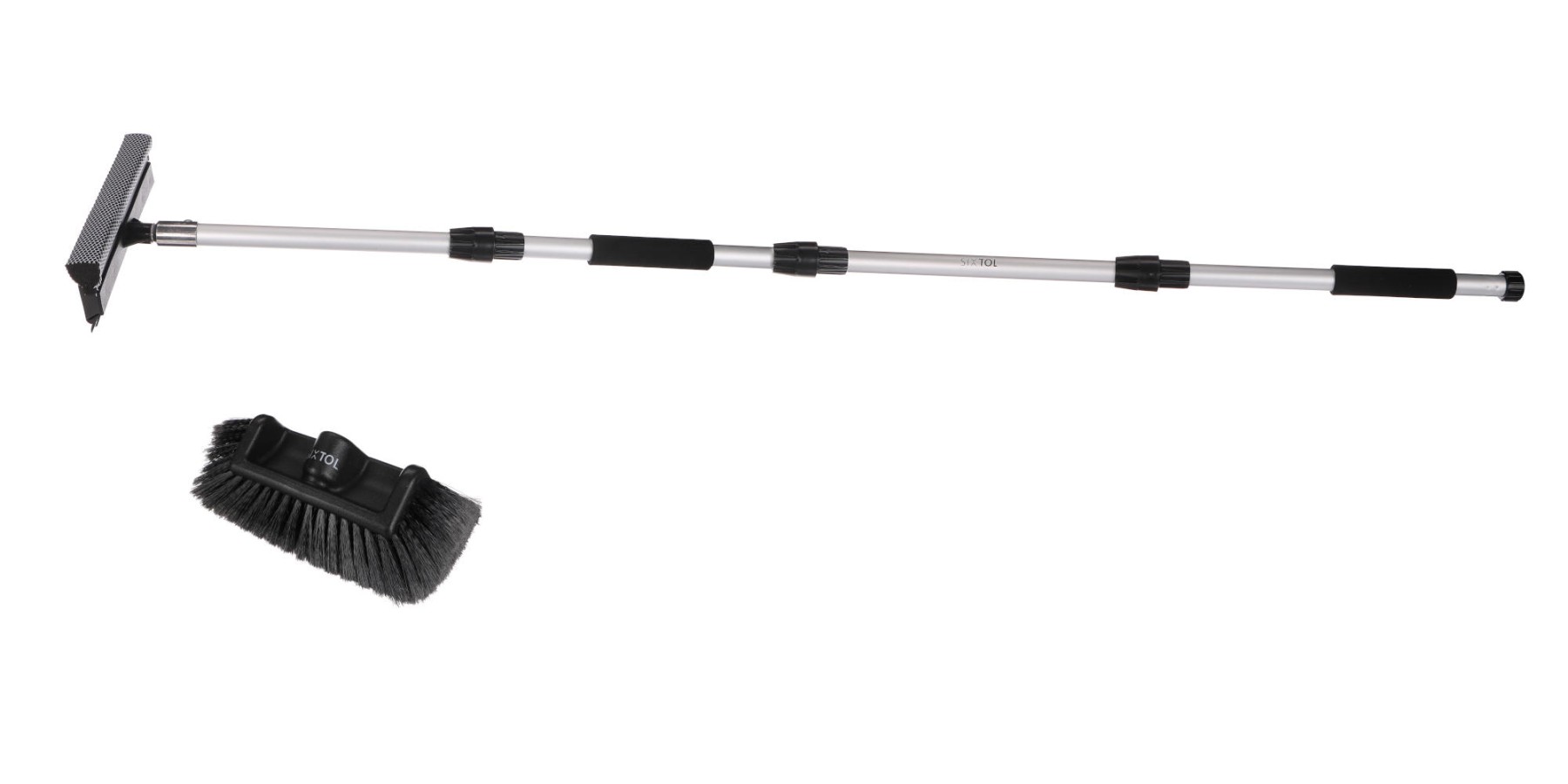 The SIXTOL CAR DETAILING WASH SET 2 flow-through brush is a practical solution for efficient washing of vehicles and other larger surfaces where a combination of reach, water and gentle cleaning is needed. Thanks to the telescopic pole with a maximum length of 240 cm, it provides easy access to car roofs, glass surfaces, shop windows or conservatories. The set is equipped with two interchangeable heads that allow both thorough washing with soft bristles and subsequent water removal using a combination of sponge and squeegee. Water flow directly through the brush increases washing efficiency and reduces the risk of surface scratching. The durable construction of aluminum and plastic is suitable for regular use in vehicle maintenance, household and outdoor areas.