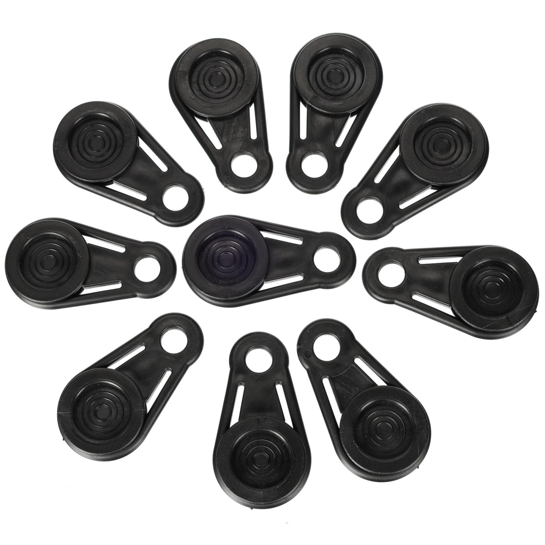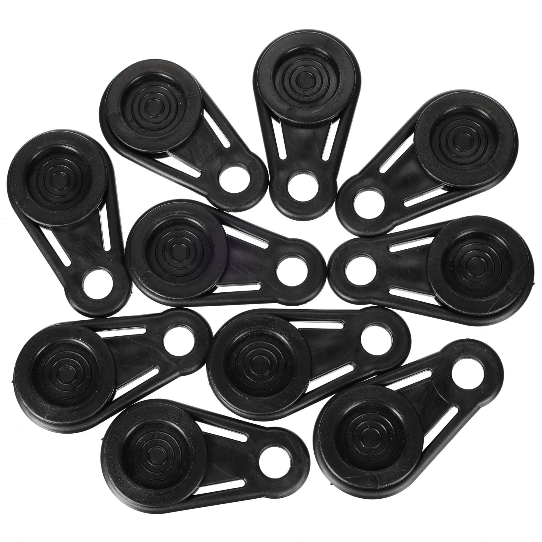The SIXTOL TRAILER TARP HOOK SET 1 contains 10 durable plastic fittings with an eye, designed for quick and reliable fastening of tarps without the need to damage them. The fittings are simply attached to the material using a clamping mechanism and create a secure point for attaching a rope, hook or cord. Thanks to the wide contact area the pressure is distributed evenly, which minimizes the risk of tearing the tarp. The durable plastic ensures long service life even with repeated use in demanding conditions. The fittings are ideal for use when covering loads, on trailers, while camping, in the garden or at home where a flexible and gentle fastening solution is needed.